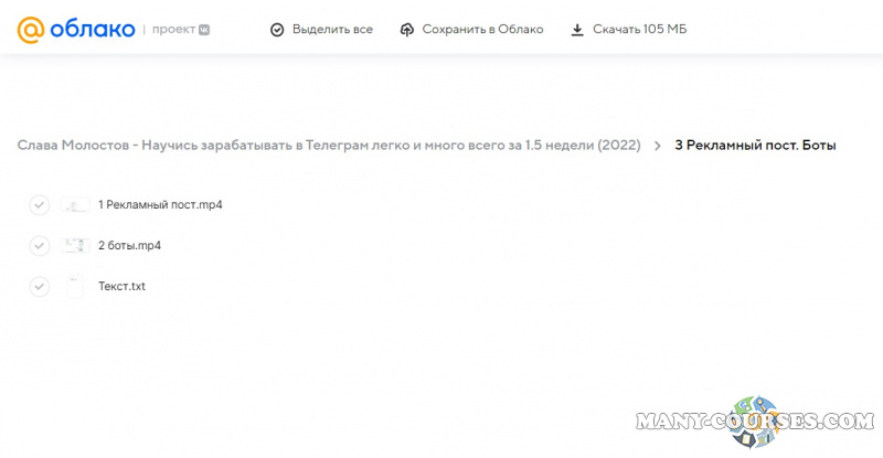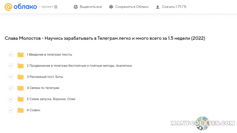 Вы находитесь на странице товара «Слава Молостов - Научись зарабатывать в Телеграм легко и много всего за 1.5 недели», это материал 2022 года, который, мы надеемся, принесет вам пользу. Данный курс расположен на платформе «Облако Mail».Скриншоты с платформы на которой расположены материалы вы можете найти выше. В нашем магазине курсы доступны по самым выгодным ценам. Вы можете перейти на оригинальный продажник, после чего принять решение о покупке. Если бы вы покупали у самого автора, то данный курс вам обошелся 14990 рублей. Вы получаете этот курс, купив в нашем магазине MANY-COURSES.NET, с огромной скидкой, всего 280 рублей. Обучающий курс входит в рубрику «SEO и SMM / Telegram / Бизнес, менеджмент, продажи / Схемы заработка», вы можете поискать другие сливы курсов в этой рубрике. В нашем магазине Вы найдёте ещё много курсов от автора «Слава Молостов», достаточно ввести в поиск имя автора.
