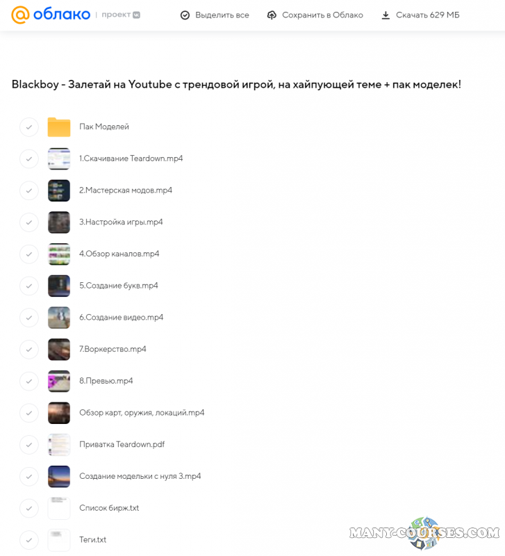 Вы находитесь на странице товара «Blackboy - Залетай на Youtube с трендовой игрой, на хайпующей теме + пак моделек!», это материал 2023 года, который, мы надеемся, принесет вам пользу. Данный курс расположен на платформе «Облако Mail».Скриншоты с платформы на которой расположены материалы вы можете найти выше. В нашем магазине курсы доступны по самым выгодным ценам. Вы можете перейти на оригинальный продажник, после чего принять решение о покупке. Если бы вы покупали у самого автора, то данный курс вам обошелся 27342 рублей. Вы получаете этот курс, купив в нашем магазине MANY-COURSES.NET, с огромной скидкой, всего 195 рублей. Обучающий курс входит в рубрику «SEO и SMM / YouTube», вы можете поискать другие сливы курсов в этой рубрике. В нашем магазине Вы найдёте ещё много курсов от автора «Blackboy», достаточно ввести в поиск имя автора.