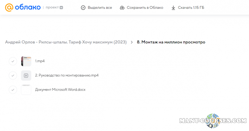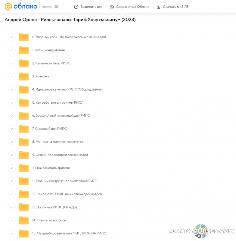 Вы находитесь на странице товара «Андрей Орлов - Рилсы-шпалы. Тариф Хочу максимум», это материал 2023 года, который, мы надеемся, принесет вам пользу. Данный курс расположен на платформе «Облако Mail».Скриншоты с платформы на которой расположены материалы вы можете найти выше. В нашем магазине курсы доступны по самым выгодным ценам. Вы получаете этот курс, купив в нашем магазине MANY-COURSES.NET, с огромной скидкой, всего 490 рублей. Обучающий курс входит в рубрику «SEO и SMM / Видео и фото / Курсы по Reels », вы можете поискать другие сливы курсов в этой рубрике. В нашем магазине Вы найдёте ещё много курсов от автора «Андрей Орлов», достаточно ввести в поиск имя автора.