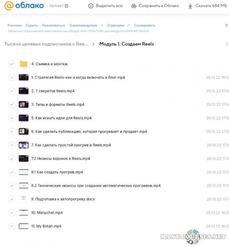 Вы находитесь на странице товара «Маргарита Былинина - Тысячи целевых подписчиков с reels», это материал 2022 года, который, мы надеемся, принесет вам пользу. Данный курс расположен на платформе «Облако Mail».Скриншоты с платформы на которой расположены материалы вы можете найти выше. В нашем магазине курсы доступны по самым выгодным ценам. Вы получаете этот курс, купив в нашем магазине MANY-COURSES.NET, с огромной скидкой, всего 350 рублей. Обучающий курс входит в рубрику «SEO и SMM / Instagram / YouTube / ТикТок / Видео и фото / Курсы по Reels », вы можете поискать другие сливы курсов в этой рубрике. В нашем магазине Вы найдёте ещё много курсов от автора «Маргарита Былинина», достаточно ввести в поиск имя автора.
