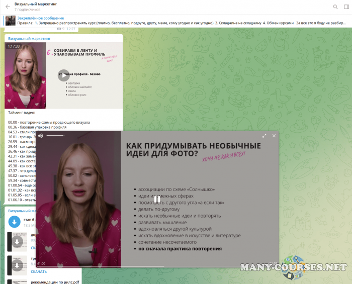 Вы находитесь на странице товара «Infilm.Ph / Саша Кустова - Визуальный маркетинг», это материал 2023 года, который, мы надеемся, принесет вам пользу. Данный курс расположен на платформе «Канал Telegram».Скриншоты с платформы на которой расположены материалы вы можете найти выше. В нашем магазине курсы доступны по самым выгодным ценам. Вы можете перейти на оригинальный продажник, после чего принять решение о покупке. Если бы вы покупали у самого автора, то данный курс вам обошелся 6990 рублей. Вы получаете этот курс, купив в нашем магазине MANY-COURSES.NET, с огромной скидкой, всего 490 рублей. Обучающий курс входит в рубрику «SEO и SMM», вы можете поискать другие сливы курсов в этой рубрике. В нашем магазине Вы найдёте ещё много курсов от автора «Саша Кустова», достаточно ввести в поиск имя автора.