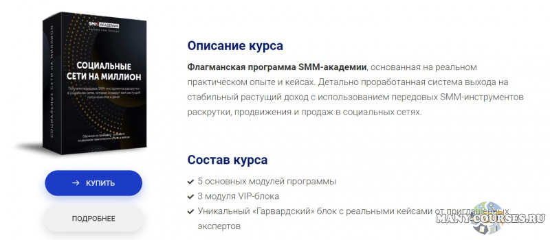 Флагманская программа SMM-Академии, основанная на реальном практическом опыте и кейсах. Детально проработанная система выхода на стабильный растущий доход с использованием передовых SMM-инструментов раскрутки, продвижения и продаж в социальных сетях.