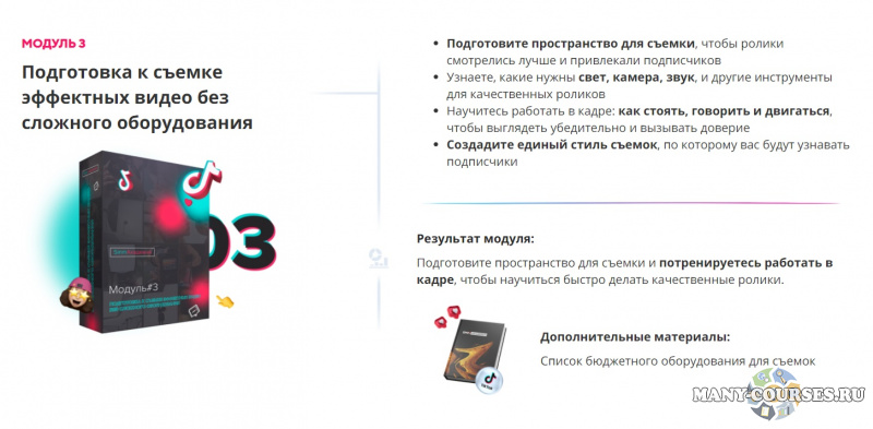 Результат модуля - Узнаете, как устроен TikTok, и как использовать его возможности для быстрого развития и монетизации вашей базы подписчиков.