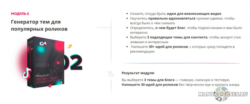 Результат модуля - Узнаете принципы создания вирусного контента в TikTok, напишете 6+ сценариев для видео, которые будут удерживать внимание и повышать охваты.