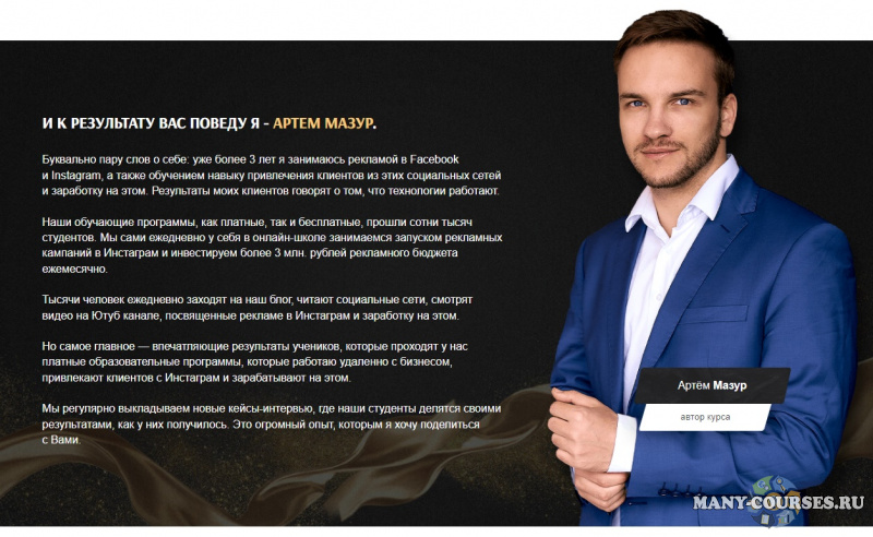 Вы находитесь на странице товара «Артём Мазур - Специалист по рекламе в Facebook и Instagram. Тариф Продвинутый, 2021», это материал 2021 года, который, мы надеемся, принесет вам пользу. Данный курс расположен на платформе «Облако Mail».Скриншоты с платформы на которой расположены материалы вы можете найти выше. В нашем магазине курсы доступны по самым выгодным ценам. Вы можете перейти на оригинальный продажник, после чего принять решение о покупке. Если бы вы покупали у самого автора, то данный курс вам обошелся 44900 рублей. Вы получаете этот курс, купив в нашем магазине MANY-COURSES.NET, с огромной скидкой, всего 550 рублей. Обучающий курс входит в рубрику «SEO и SMM / Instagram / Facebook / Реклама и маркетинг», вы можете поискать другие сливы курсов в этой рубрике. В нашем магазине Вы найдёте ещё много курсов от автора «Артём Мазур», достаточно ввести в поиск имя автора.