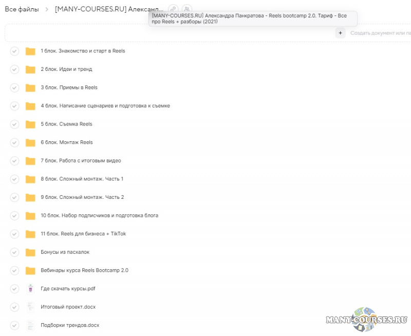 Вы находитесь на странице товара «Александра Панкратова - Reels bootcamp 2.0. Тариф - Все про Reels + разборы», это материал 2021 года, который, мы надеемся, принесет вам пользу. Данный курс расположен на платформе «Облако Mail».Скриншоты с платформы на которой расположены материалы вы можете найти выше. В нашем магазине курсы доступны по самым выгодным ценам. Если бы вы покупали у самого автора, то данный курс вам обошелся 34300 рублей. Вы получаете этот курс, купив в нашем магазине MANY-COURSES.NET, с огромной скидкой, всего 450 рублей. Обучающий курс входит в рубрику «SEO и SMM / Instagram / Курсы по Reels », вы можете поискать другие сливы курсов в этой рубрике. В нашем магазине Вы найдёте ещё много курсов от автора «Александра Панкратова», достаточно ввести в поиск имя автора.
