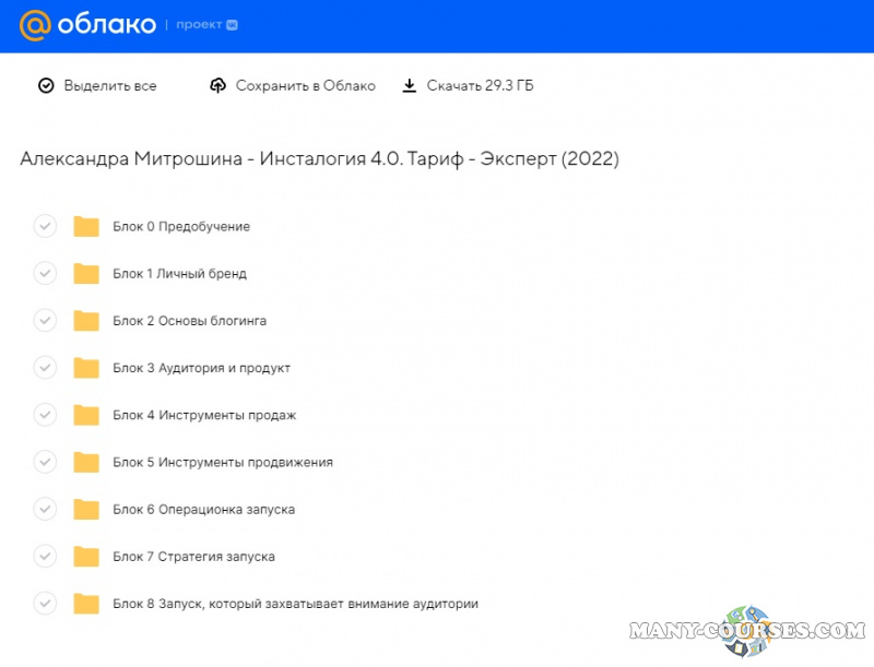 Вы находитесь на странице товара «Александра Митрошина - Инсталогия 4.0. Тариф - Эксперт», это материал 2022 года, который, мы надеемся, принесет вам пользу. Данный курс расположен на платформе «Облако Mail».Скриншоты с платформы на которой расположены материалы вы можете найти выше. В нашем магазине курсы доступны по самым выгодным ценам. Вы можете перейти на оригинальный продажник, после чего принять решение о покупке. Если бы вы покупали у самого автора, то данный курс вам обошелся 63920 рублей. Вы получаете этот курс, купив в нашем магазине MANY-COURSES.NET, с огромной скидкой, всего 300 рублей. Обучающий курс входит в рубрику «SEO и SMM / Instagram», вы можете поискать другие сливы курсов в этой рубрике. В нашем магазине Вы найдёте ещё много курсов от автора «Александра Митрошина», достаточно ввести в поиск имя автора.
