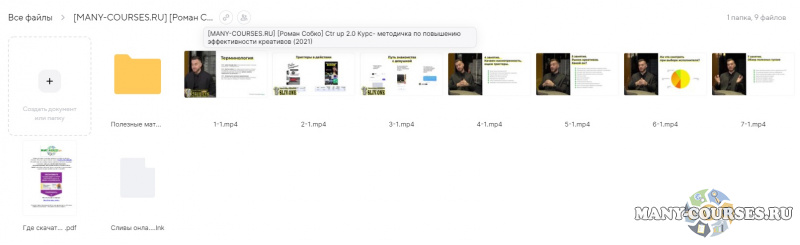 Вы находитесь на странице товара «Роман Собко - Ctr up 2.0 Курс- методичка по повышению эффективности креативов», это материал 2021 года, который, мы надеемся, принесет вам пользу. Данный курс расположен на платформе «Облако Mail».Скриншоты с платформы на которой расположены материалы вы можете найти выше. В нашем магазине курсы доступны по самым выгодным ценам. Вы можете перейти на оригинальный продажник, после чего принять решение о покупке. Если бы вы покупали у самого автора, то данный курс вам обошелся 7933 рублей. Вы получаете этот курс, купив в нашем магазине MANY-COURSES.NET, с огромной скидкой, всего 70 рублей. Обучающий курс входит в рубрику «SEO и SMM», вы можете поискать другие сливы курсов в этой рубрике. В нашем магазине Вы найдёте ещё много курсов от автора «Роман Собко», достаточно ввести в поиск имя автора.