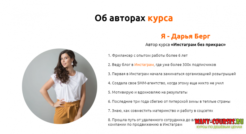 Вы находитесь на странице товара «Дарья Берг, Ирина Смирнова - Инстаграм без прикрас. Тариф «Сами с усами» (2020)», это материал 2020 года, который, мы надеемся, принесет вам пользу. Данный курс расположен на платформе «Яндекс Диск».Скриншоты с платформы на которой расположены материалы вы можете найти выше. В нашем магазине курсы доступны по самым выгодным ценам. Вы можете перейти на оригинальный продажник, после чего принять решение о покупке. Если бы вы покупали у самого автора, то данный курс вам обошелся 34020 рублей. Вы получаете этот курс, купив в нашем магазине MANY-COURSES.NET, с огромной скидкой, всего 99 рублей. Обучающий курс входит в рубрику «Instagram / SEO и SMM», вы можете поискать другие сливы курсов в этой рубрике. В нашем магазине Вы найдёте ещё много курсов от автора «Дарья Берг, Ирина Смирнова», достаточно ввести в поиск имя автора.