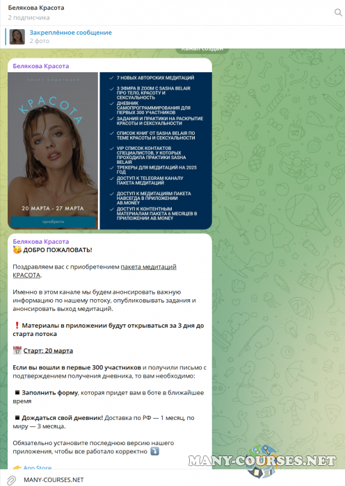 Вы находитесь на странице товара «Ab.Money / Александра Белякова - Пакет медитаций Красота. Тариф Красота», это материал 2025 года, который, мы надеемся, принесет вам пользу. Данный курс расположен на платформе «Канал Telegram».Скриншоты с платформы на которой расположены материалы вы можете найти выше. В нашем магазине курсы доступны по самым выгодным ценам. Вы получаете этот курс, купив в нашем магазине MANY-COURSES.NET, с огромной скидкой, всего 1990 рублей. Обучающий курс входит в рубрику «Курсы от Александры Беляковой / Эзотерика и оккультизм / Медитации», вы можете поискать другие сливы курсов в этой рубрике. В нашем магазине Вы найдёте ещё много курсов от автора «Александра Белякова», достаточно ввести в поиск имя автора.
