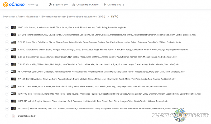 Вы находитесь на странице товара «liveclasses / Антон Мартынов - 120 самых известных фотографов всех времен (2021)», это материал 2021 года, который, мы надеемся, принесет вам пользу. Данный курс расположен на платформе «Облако Mail».Скриншоты с платформы на которой расположены материалы вы можете найти выше. В нашем магазине курсы доступны по самым выгодным ценам. Вы получаете этот курс, купив в нашем магазине MANY-COURSES.NET, с огромной скидкой, всего 70 рублей. Обучающий курс входит в рубрику «Скоро», вы можете поискать другие сливы курсов в этой рубрике. В нашем магазине Вы найдёте ещё много курсов от автора «Антон Мартынов», достаточно ввести в поиск имя автора.