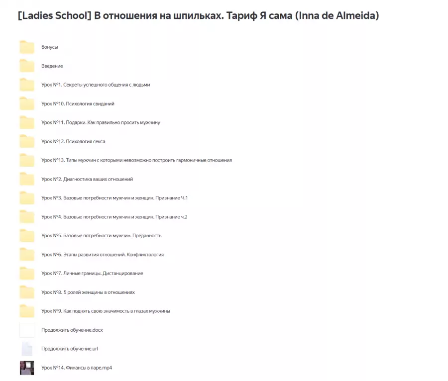 Вы находитесь на странице товара «Ladies School / Inna de Almeida - В отношения на шпильках 22. Тариф Я сама. Октябрь-Ноябрь 2024», это материал который, мы надеемся, принесет вам пользу. Данный курс расположен на платформе «Яндекс Диск».Скриншоты с платформы на которой расположены материалы вы можете найти выше. В нашем магазине курсы доступны по самым выгодным ценам. Вы получаете этот курс, купив в нашем магазине MANY-COURSES.NET, с огромной скидкой, всего 1990 рублей. Обучающий курс входит в рубрику «Соблазнение и пикап», вы можете поискать другие сливы курсов в этой рубрике. В нашем магазине Вы найдёте ещё много курсов от автора «Inna de Almeida», достаточно ввести в поиск имя автора.