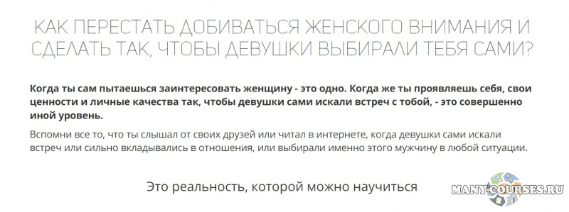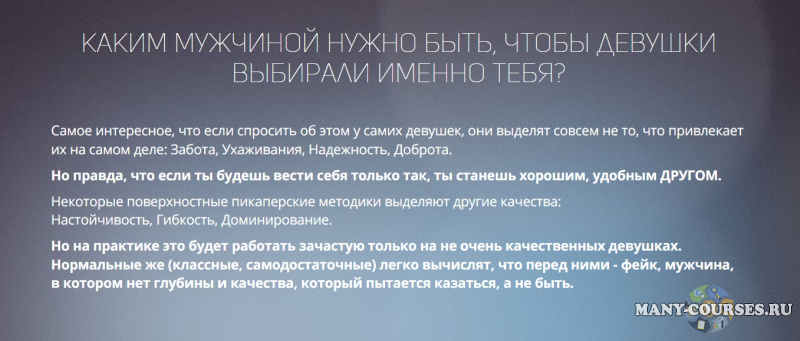 На предстоящем курсе на трех семинарах мы подробно разберем то, КАКИМИ качествами должен обладать мужчина и КАК правильно проявлять их в общении