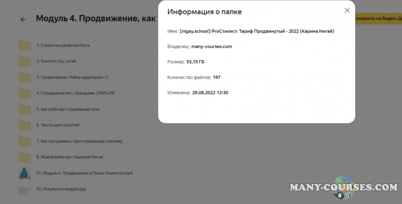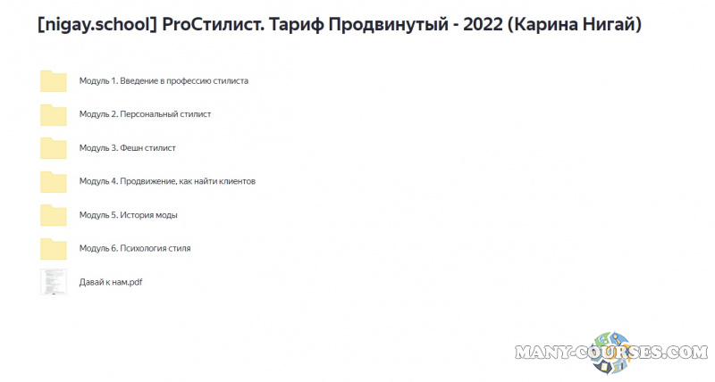 Вы находитесь на странице товара «nigay.school / Карина Нигай - ProСтилист. Тариф Продвинутый+ProFashion», это материал 2022 года, который, мы надеемся, принесет вам пользу. Данный курс расположен на платформе «Яндекс Диск».Скриншоты с платформы на которой расположены материалы вы можете найти выше. В нашем магазине курсы доступны по самым выгодным ценам. Вы получаете этот курс, купив в нашем магазине MANY-COURSES.NET, с огромной скидкой, всего 890 рублей. Обучающий курс входит в рубрику «Стиль и имидж», вы можете поискать другие сливы курсов в этой рубрике. В нашем магазине Вы найдёте ещё много курсов от автора «Карина Нигай», достаточно ввести в поиск имя автора.