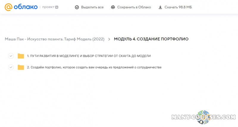 Вы находитесь на странице товара «Маша Пак - Искусство позинга. Тариф Модель», это материал 2022 года, который, мы надеемся, принесет вам пользу. Данный курс расположен на платформе «Облако Mail».Скриншоты с платформы на которой расположены материалы вы можете найти выше. В нашем магазине курсы доступны по самым выгодным ценам. Вы можете перейти на оригинальный продажник, после чего принять решение о покупке. Если бы вы покупали у самого автора, то данный курс вам обошелся 30990 рублей. Вы получаете этот курс, купив в нашем магазине MANY-COURSES.NET, с огромной скидкой, всего 690 рублей. Обучающий курс входит в рубрику «Стиль и имидж / Видео и фото / Психология», вы можете поискать другие сливы курсов в этой рубрике. В нашем магазине Вы найдёте ещё много курсов от автора «Маша Пак», достаточно ввести в поиск имя автора.