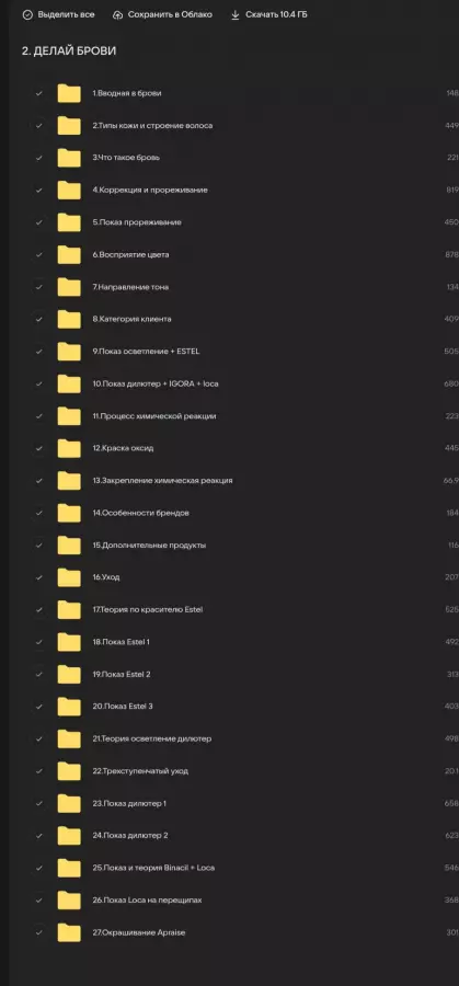 | ОСНОВНОЕ ОБУЧЕНИЕ | - ПРОДАВАЙ 1.Вводная лекция 2.Постановка целей 3.Позиционирование мастера. Активы 4.Распаковка контента 5.Якорения в блоге. Личный бренд 6.Упаковка социальных сетей 7.Анализ конкурентов 8.Анализ ЦА, кастдэв 9.Покажи мне свою воронку 10.Сторителлинги и прогревы 11.Конструктор stories 12.Съёмка фото 13.REELS 14.Сервис и работа с клиентами 15.Работа с моделями 16.Прайс 17.Учёт лидов, работа с клиентской базой, возвращаемость 18.Скрипты 19.Самозванец - ДЕЛАЙ БРОВИ 1.Вводная в брови 2.Типы кожи и строение волоса 3.Что такое бровь 4.Коррекция и прореживание 5.Показ прореживание 6.Восприятие цвета 7.Направление тона 8.Категория клиента 9.Показ осветление + ESTEL 10.Показ дилютер + IGORA + loca 11.Процесс химической реакции 12.Краска оксид 13.Закрепление химическая реакция 14.Особенности брендов 15.Дополнительные продукты 16.Уход 17.Теория по красителю Estel 18.Показ Estel 1 19.Показ Estel 2 20.Показ Estel 3 21.Теория осветление дилютер 22.Трехступенчатый уход 23.Показ дилютер 1 24.Показ дилютер 2 25.Показ и теория Binacil + Loca 26.Показ Loca на перещипах 27.Окрашивание Apraise - ЗАРАБАТЫВАЙ 1.Трафик 2.ДДС |