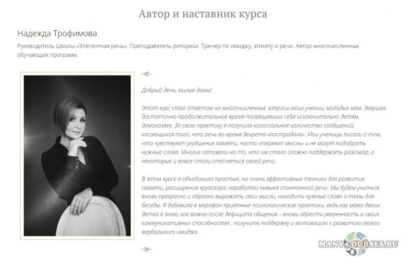 Вы находитесь на странице товара «Надежда Трофимова - Речь в декрете», это материал 2021 года, который, мы надеемся, принесет вам пользу. Данный курс расположен на платформе «Облако Mail».Скриншоты с платформы на которой расположены материалы вы можете найти выше. В нашем магазине курсы доступны по самым выгодным ценам. Вы можете перейти на оригинальный продажник, после чего принять решение о покупке. Если бы вы покупали у самого автора, то данный курс вам обошелся 8200 рублей. Вы получаете этот курс, купив в нашем магазине MANY-COURSES.NET, с огромной скидкой, всего 149 рублей. Обучающий курс входит в рубрику «Стиль и имидж», вы можете поискать другие сливы курсов в этой рубрике. В нашем магазине Вы найдёте ещё много курсов от автора «Надежда Трофимова», достаточно ввести в поиск имя автора.