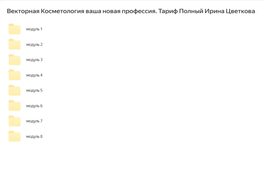 Вы находитесь на странице товара «Ирина Цветкова - Векторная Косметология. Ваша новая профессия. Тариф Полный», это материал который, мы надеемся, принесет вам пользу. Данный курс расположен на платформе «Яндекс Диск».Скриншоты с платформы на которой расположены материалы вы можете найти выше. В нашем магазине курсы доступны по самым выгодным ценам. Вы можете перейти на оригинальный продажник, после чего принять решение о покупке. Вы получаете этот курс, купив в нашем магазине MANY-COURSES.NET, с огромной скидкой, всего 1300 рублей. Обучающий курс входит в рубрику «Стиль и имидж / Макияж и косметология / Уход за кожей и телом», вы можете поискать другие сливы курсов в этой рубрике. В нашем магазине Вы найдёте ещё много курсов от автора «Ирина Цветкова», достаточно ввести в поиск имя автора.