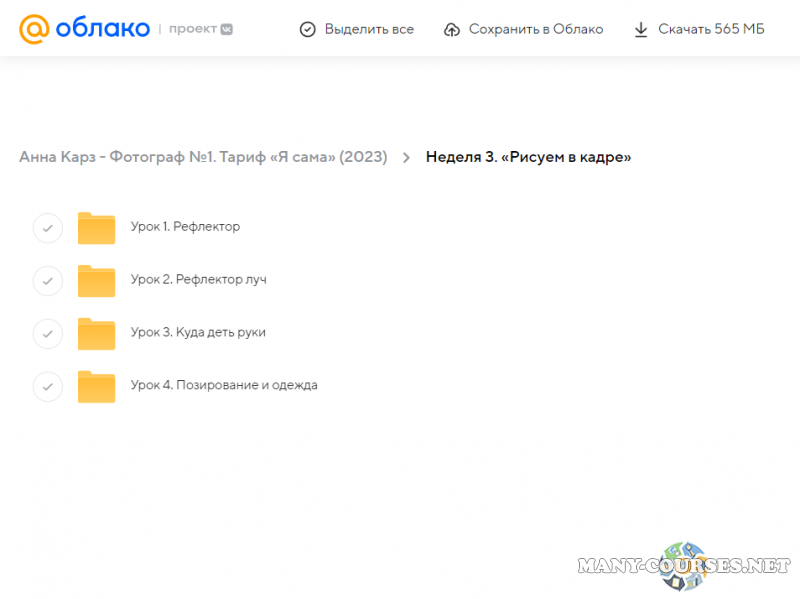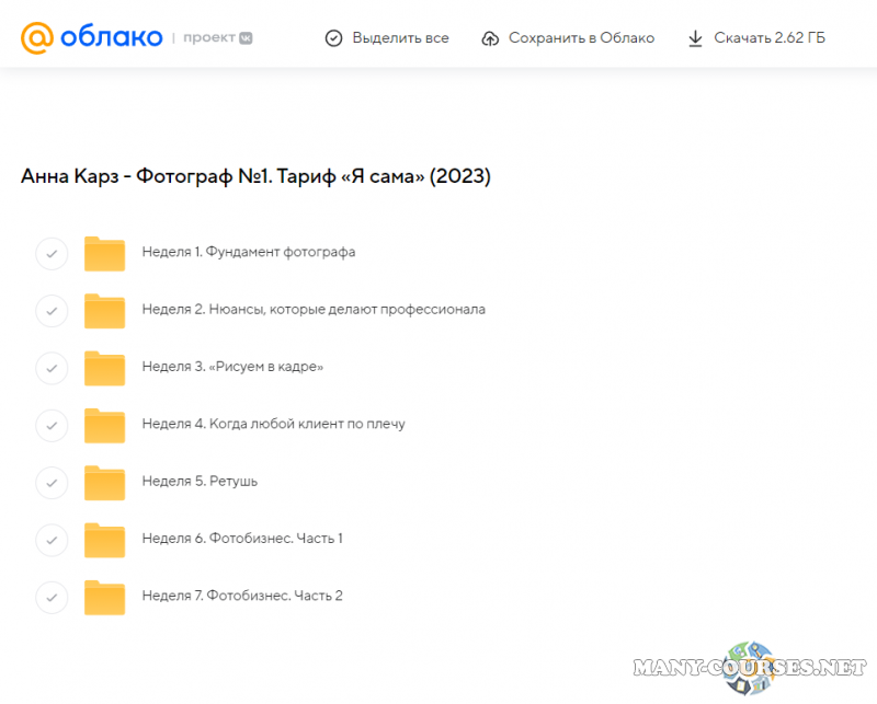 Вы находитесь на странице товара «Анна Карз - Фотограф №1. Тариф «Я сама» (2023)», это материал 2023 года, который, мы надеемся, принесет вам пользу. Данный курс расположен на платформе «Облако Mail».Скриншоты с платформы на которой расположены материалы вы можете найти выше. В нашем магазине курсы доступны по самым выгодным ценам. Вы можете перейти на оригинальный продажник, после чего принять решение о покупке. Вы получаете этот курс, купив в нашем магазине MANY-COURSES.NET, с огромной скидкой, всего 749 рублей. Обучающий курс входит в рубрику «Видео и фото / Саморазвитие и мотивация», вы можете поискать другие сливы курсов в этой рубрике. В нашем магазине Вы найдёте ещё много курсов от автора «Анна Карз», достаточно ввести в поиск имя автора.
