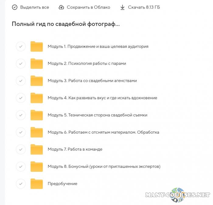 Вы находитесь на странице товара «Настя Николаева - Полный гид по свадебной фотографии. Тариф Prof», это материал 2021 года, который, мы надеемся, принесет вам пользу. Данный курс расположен на платформе «Облако Mail».Скриншоты с платформы на которой расположены материалы вы можете найти выше. В нашем магазине курсы доступны по самым выгодным ценам. Вы получаете этот курс, купив в нашем магазине MANY-COURSES.NET, с огромной скидкой, всего 750 рублей. Обучающий курс входит в рубрику «Видео и фото», вы можете поискать другие сливы курсов в этой рубрике. В нашем магазине Вы найдёте ещё много курсов от автора «Настя Николаева», достаточно ввести в поиск имя автора.