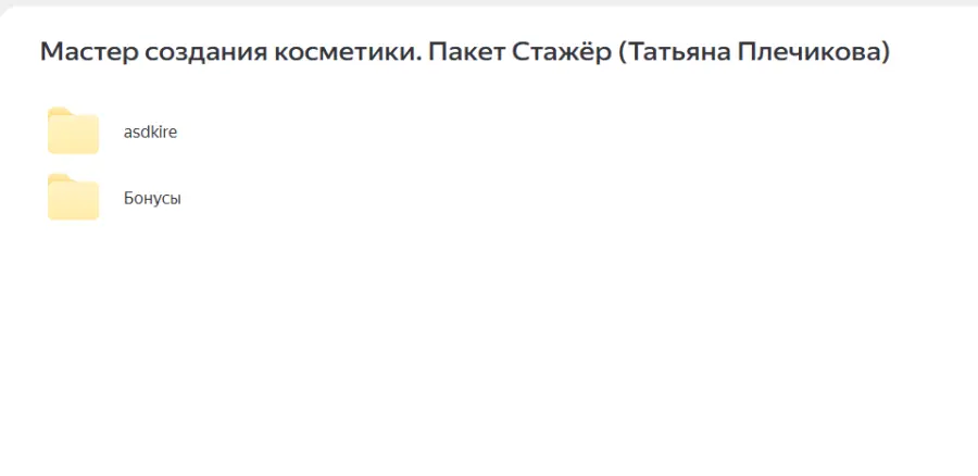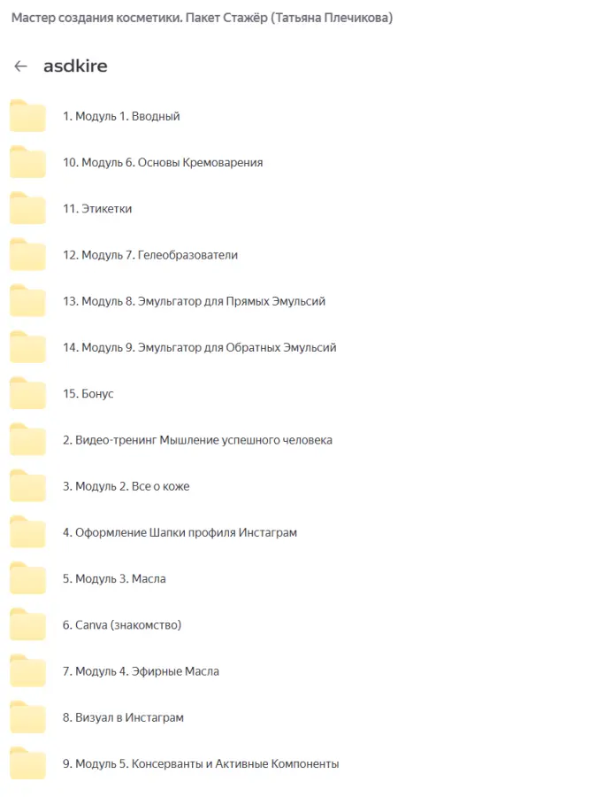Вы находитесь на странице товара «Татьяна Плечикова - Мастер создания косметики. Пакет Стажёр», это материал который, мы надеемся, принесет вам пользу. Данный курс расположен на платформе «Яндекс Диск».Скриншоты с платформы на которой расположены материалы вы можете найти выше. В нашем магазине курсы доступны по самым выгодным ценам. Вы можете перейти на оригинальный продажник, после чего принять решение о покупке. Вы получаете этот курс, купив в нашем магазине MANY-COURSES.NET, с огромной скидкой, всего 495 рублей. Обучающий курс входит в рубрику «Хобби и рукоделие», вы можете поискать другие сливы курсов в этой рубрике. В нашем магазине Вы найдёте ещё много курсов от автора «Татьяна Плечикова», достаточно ввести в поиск имя автора.