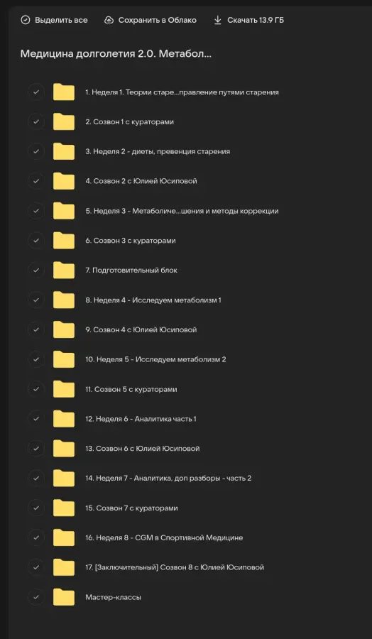 Вы находитесь на странице товара «Юлия Юсипова - Медицина долголетия. Метаболизм 2025. Тариф Без диплома», это материал который, мы надеемся, принесет вам пользу. Данный курс расположен на платформе «Облако Mail».Скриншоты с платформы на которой расположены материалы вы можете найти выше. В нашем магазине курсы доступны по самым выгодным ценам. Вы получаете этот курс, купив в нашем магазине MANY-COURSES.NET, с огромной скидкой, всего 2390 рублей. Обучающий курс входит в рубрику «Здоровье и Спорт», вы можете поискать другие сливы курсов в этой рубрике. В нашем магазине Вы найдёте ещё много курсов от автора «Юлия Юсипова», достаточно ввести в поиск имя автора.