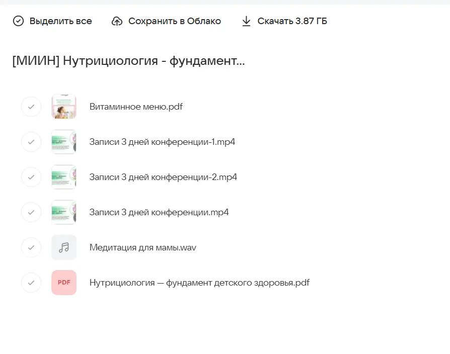 Вы находитесь на странице товара «МИИН / Ната Гончар - Нутрициология - фундамент детского здоровья. Тариф слушаю и учавствую», это материал который, мы надеемся, принесет вам пользу. Данный курс расположен на платформе «Облако Mail».Скриншоты с платформы на которой расположены материалы вы можете найти выше. В нашем магазине курсы доступны по самым выгодным ценам. Вы получаете этот курс, купив в нашем магазине MANY-COURSES.NET, с огромной скидкой, всего 90 рублей. Обучающий курс входит в рубрику «Здоровье и Спорт», вы можете поискать другие сливы курсов в этой рубрике. В нашем магазине Вы найдёте ещё много курсов от автора «Ната Гончар», достаточно ввести в поиск имя автора.