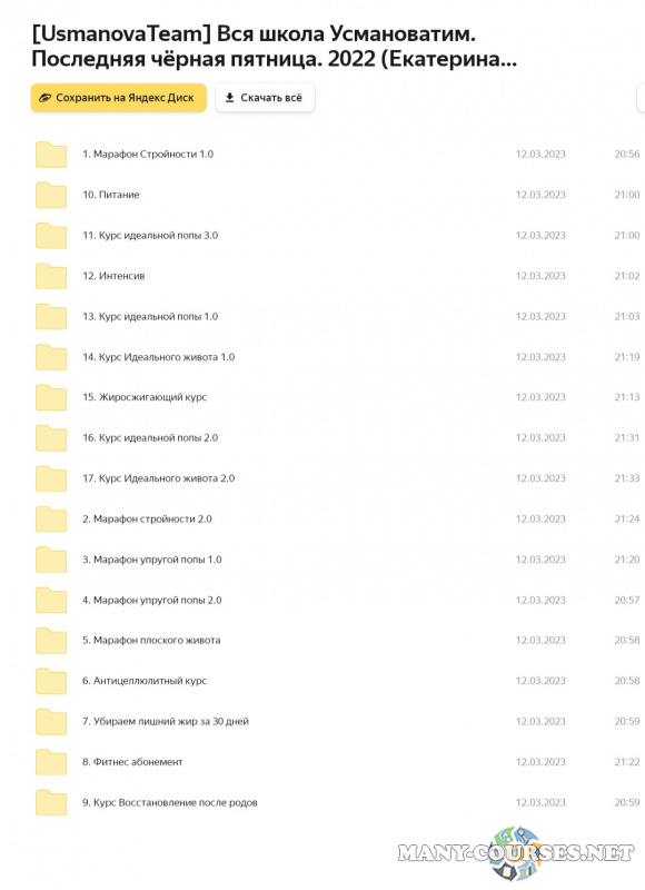 Вы находитесь на странице товара «UsmanovaTeam / Екатерина Усманова - Вся школа Усмановатим. Последняя чёрная пятница», это материал 2023 года, который, мы надеемся, принесет вам пользу. Данный курс расположен на платформе «Яндекс Диск».Скриншоты с платформы на которой расположены материалы вы можете найти выше. В нашем магазине курсы доступны по самым выгодным ценам. Вы получаете этот курс, купив в нашем магазине MANY-COURSES.NET, с огромной скидкой, всего 550 рублей. Обучающий курс входит в рубрику «Здоровье и Спорт», вы можете поискать другие сливы курсов в этой рубрике. В нашем магазине Вы найдёте ещё много курсов от автора «Екатерина Усманова», достаточно ввести в поиск имя автора.