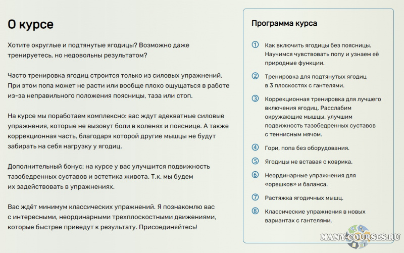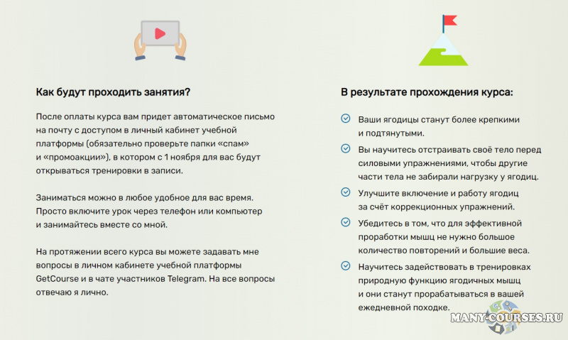 На курсе мы поработаем комплексно: вас ждут адекватные силовые упражнения, которые не вызовут боли в коленях и пояснице. А также коррекционная часть, благодаря которой другие мышцы не будут забирать на себя нагрузку у ягодиц.