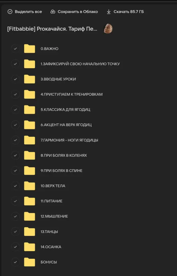 Вы находитесь на странице товара «Fitbabbie - Proкачайся. Тариф Персик», это материал который, мы надеемся, принесет вам пользу. Данный курс расположен на платформе «Облако Mail».Скриншоты с платформы на которой расположены материалы вы можете найти выше. В нашем магазине курсы доступны по самым выгодным ценам. Если бы вы покупали у самого автора, то данный курс вам обошелся 15000 рублей. Вы получаете этот курс, купив в нашем магазине MANY-COURSES.NET, с огромной скидкой, всего 990 рублей. Обучающий курс входит в рубрику «Здоровье и Спорт», вы можете поискать другие сливы курсов в этой рубрике. В нашем магазине Вы найдёте ещё много курсов от автора «Fitbabbie», достаточно ввести в поиск имя автора.